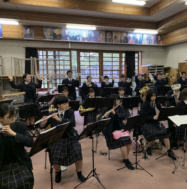 先日、音楽室にてミニコンサートを行いました。新1年生を始め、2、3年生や先生方もお越し下さいました。既に入部してくれた1年生も演奏に参加し、大変盛り上がりました。