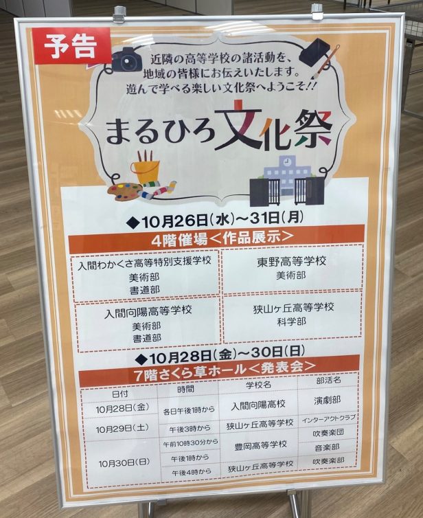10月26日(水)~10月31日(月)【10:00~19:30(最終日のみ16時まで)】にまるひろ入間店で「まるひろ文化祭」が行われます。東野高校からは美術部が参加をします。市内の学校さんと共に多くの作品を4階催事場に展示します。美術部としては本校文化祭で展示した大きな絵(3m×7m)の原画や制作風景の様子も展示しています。個人の新作も数多く展示しています。是非ともご高覧くださいませ。