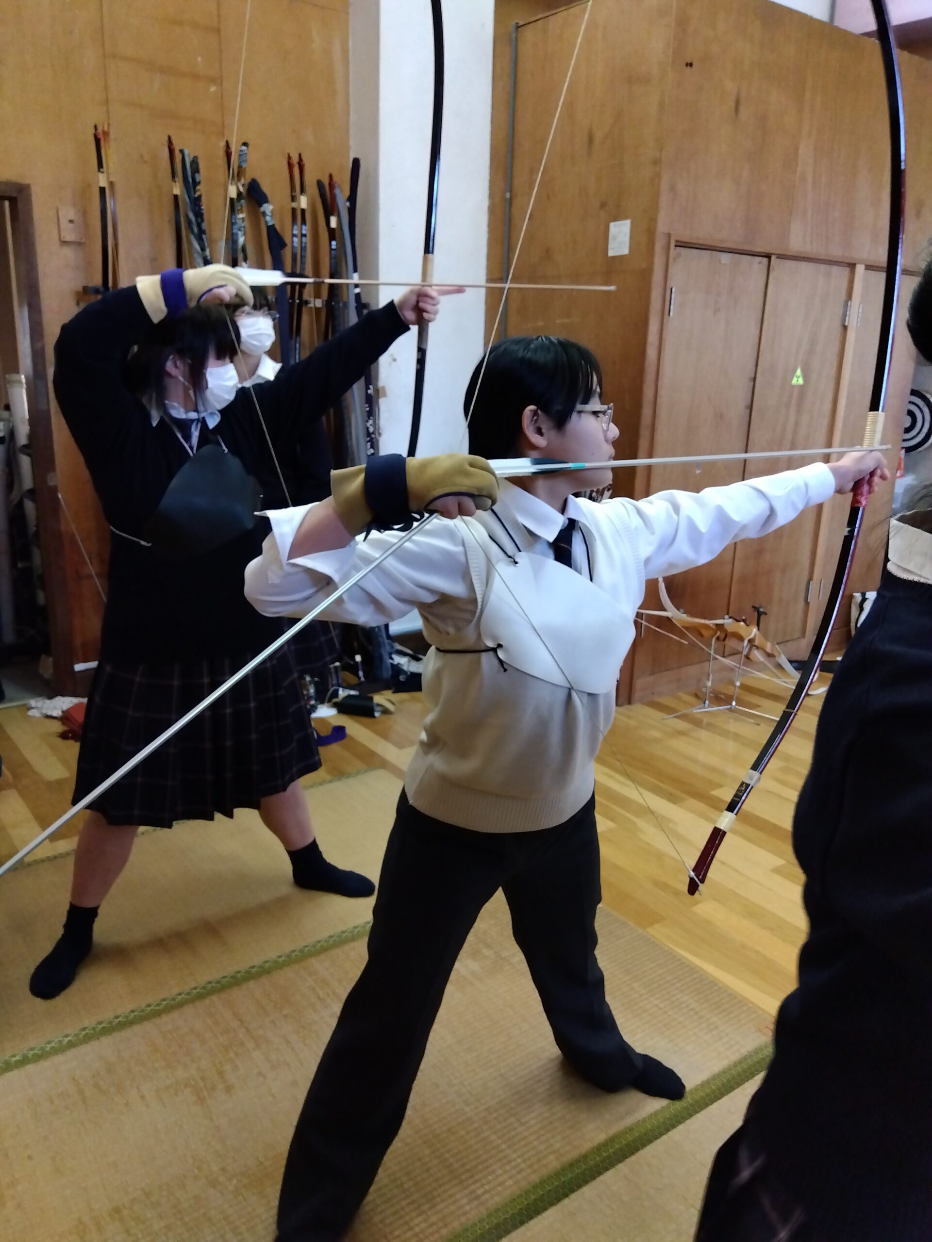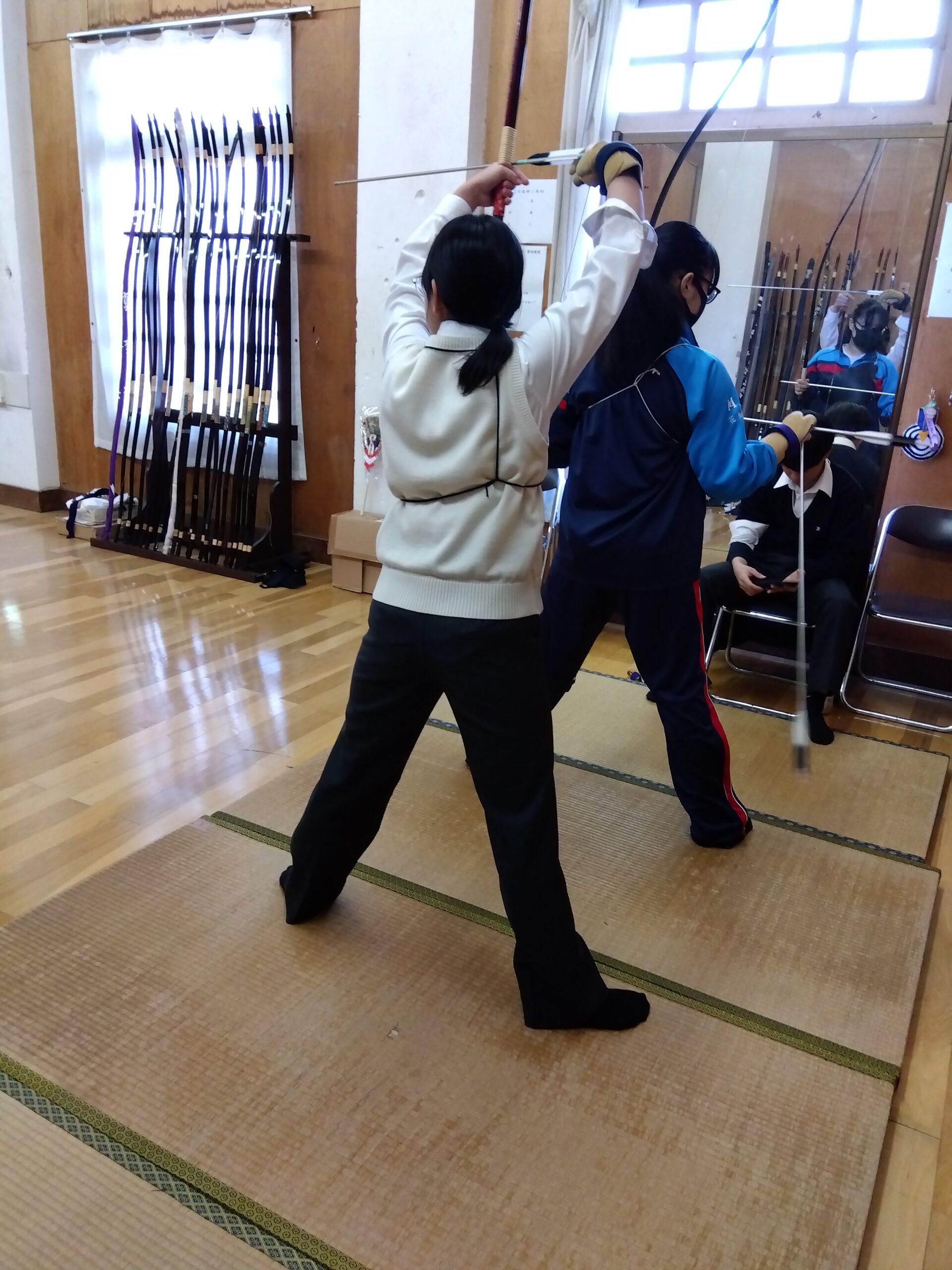 大掃除の際、道場の前に鏡を設置したので、各自自分の射形を確認しながら引いていました。