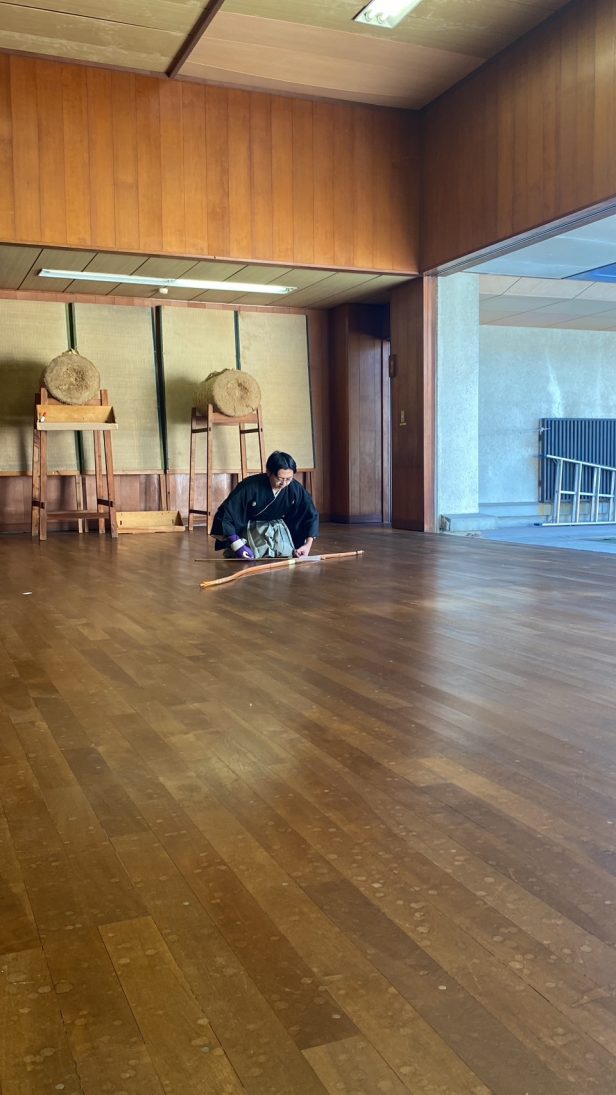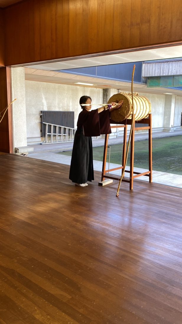 まずは師範による巻藁射礼です。巻藁射礼はお祝いの時に行われる最高格の射礼の1つです。
