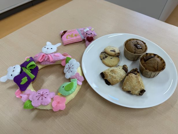 この日に合わせて、2月のバレンタインに参加できなかった部長さんが、手づくりのチョコレートポーチとうさぎのマスコットを持参してくださいました。今回は偶然にもチョコレートを使ったお菓子。素敵に彩ってくれていますね。