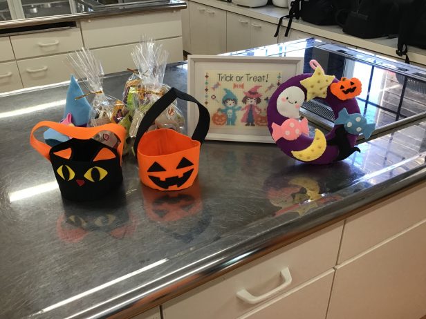 10月末のハロウィンに向けて、お菓子を入れる簡単なバッグをつくりましたよ。中学生の方にはかぼちゃタイプ、部員にはひと手間かかかる黒猫タイプをつくってもらいました。各パーツの型取りから、まつり縫い、ボタンつけまで皆必死に頑張り、全員が完成させて帰ることができきました。最後にちょっとしたお菓子をおすそ分け。中学生の方にも「来てよかったな」と思えるような時間であったならうれしく思います。