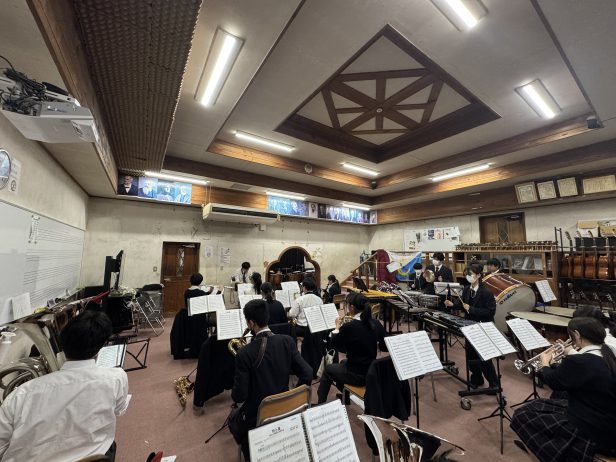 大講堂(入学式を行った場所です)隣の音楽室で練習を行っています。そして今は様々な楽器の体験会を行っています。