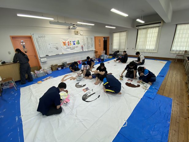 芸術部(美術)ではお盆休み前に盈華祭での展示に向けて、部員全員で描く「共同制作作品(タテ7m×ヨコ3.5m)」に取り組みました!