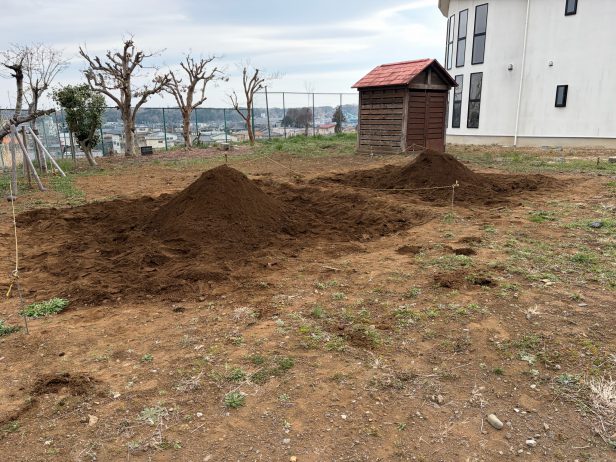 最近ようやく暖かくなってきたので、今日は夏の収穫を目指して、「土づくり」を行いました。