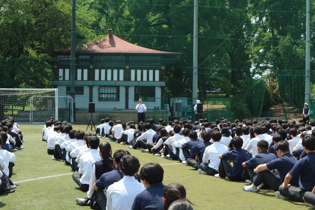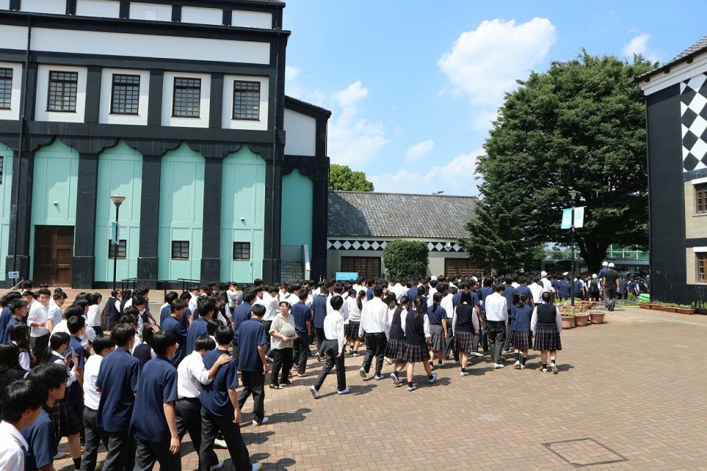 今回は、東海・関東大地震を想定した訓練を行いました。地震発生の緊急放送を教室で聞いた生徒たちは、教員の指示に従い、落ち着いて総合グラウンドへ避難しました。