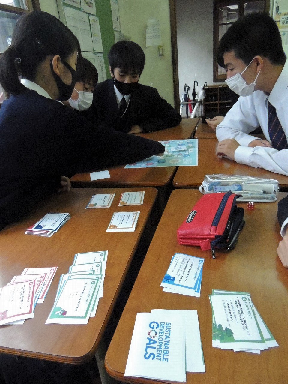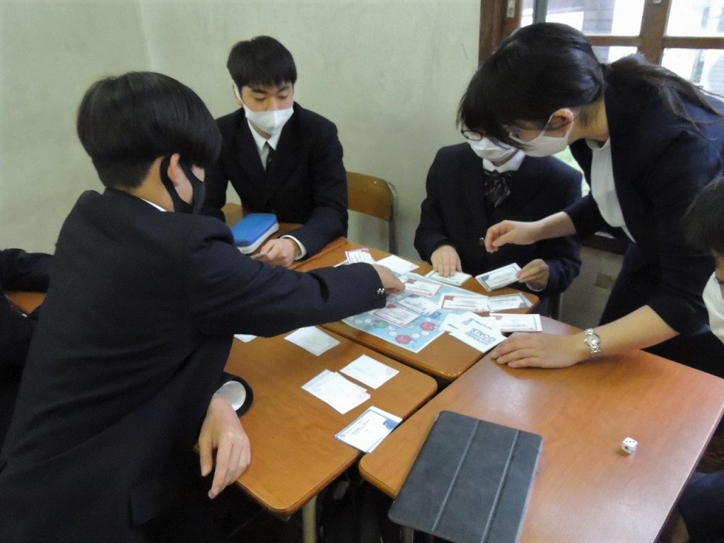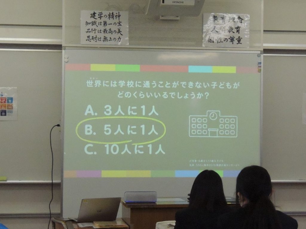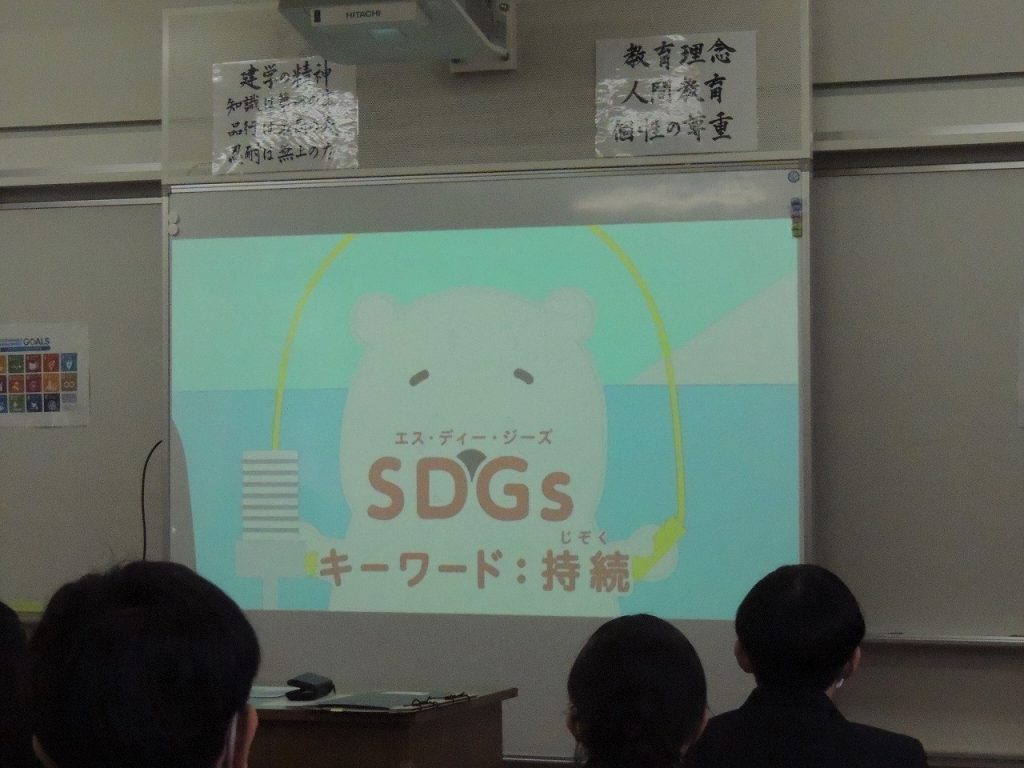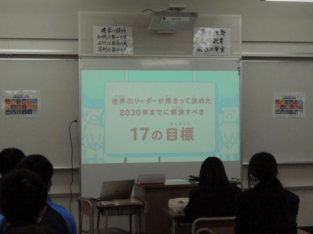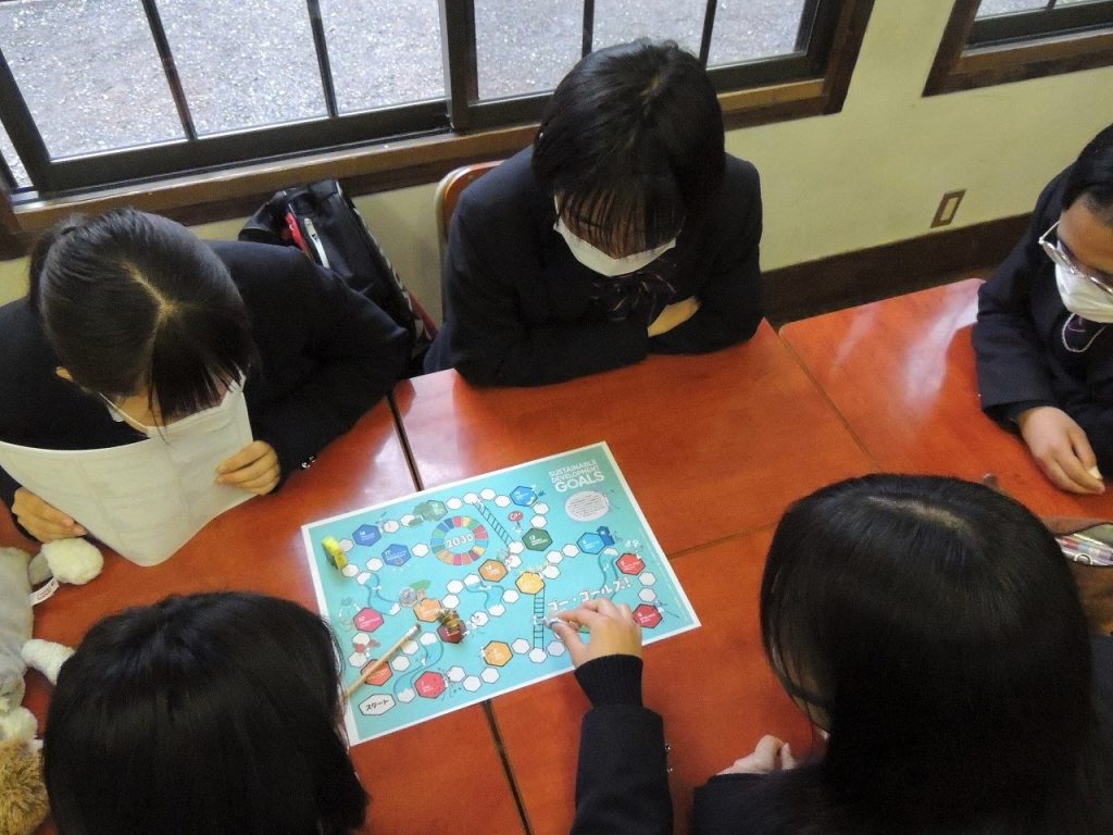 土曜日1限の「総合的な探求の時間」を利用し、各クラスごとに導入としてSDGsの解説動画を視聴したり、17のゴールへの道筋をすごろく形式で確認するゲームに取り組むなどしながら、生徒一人ひとりの取り組み、クラスとしての取り組みについて意見交換しました。