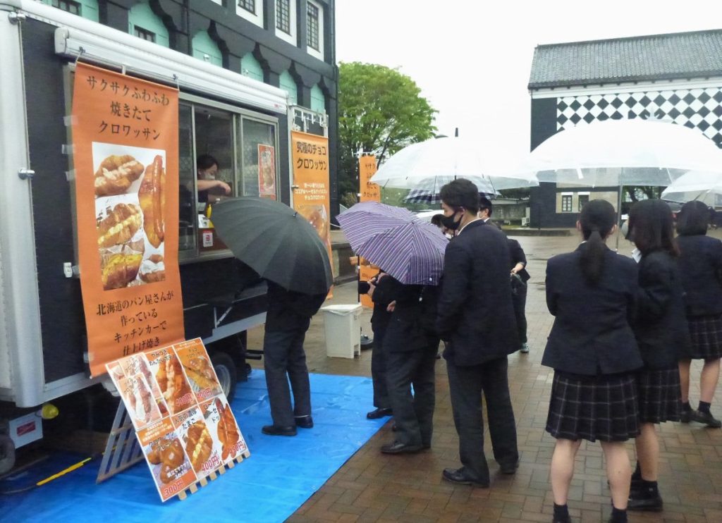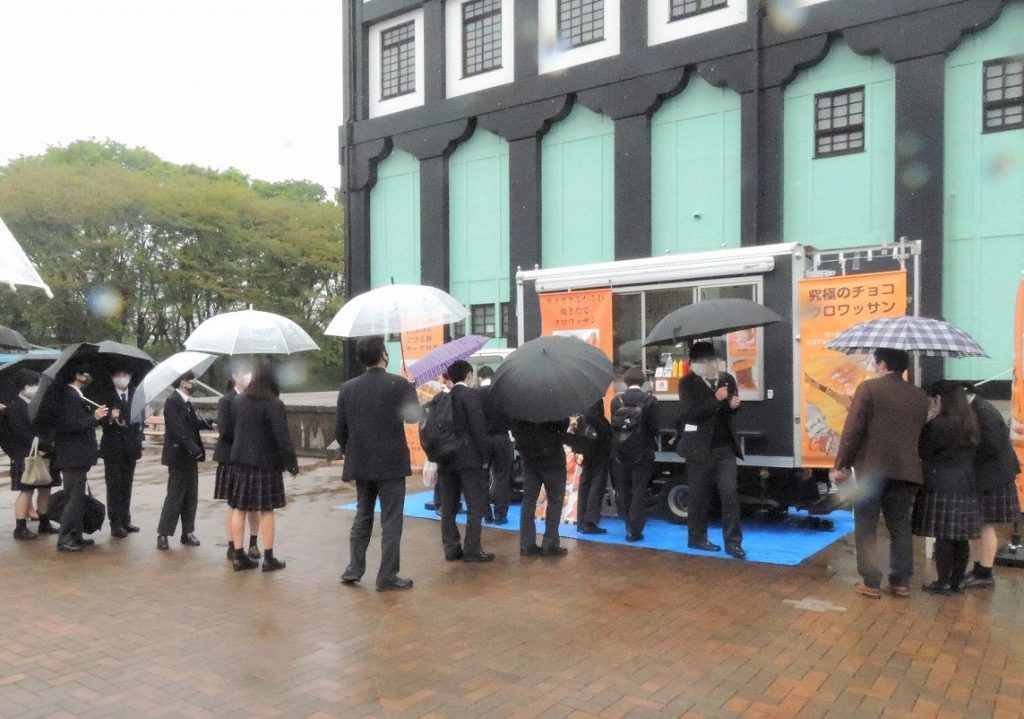 また、昼にはキッチンカーが来校。SDGsの取り組みの一つとして食糧問題への関心を高めてもらおうという試みです。生徒たちはふだんのお弁当とは違ったメニューを楽しんでいました。