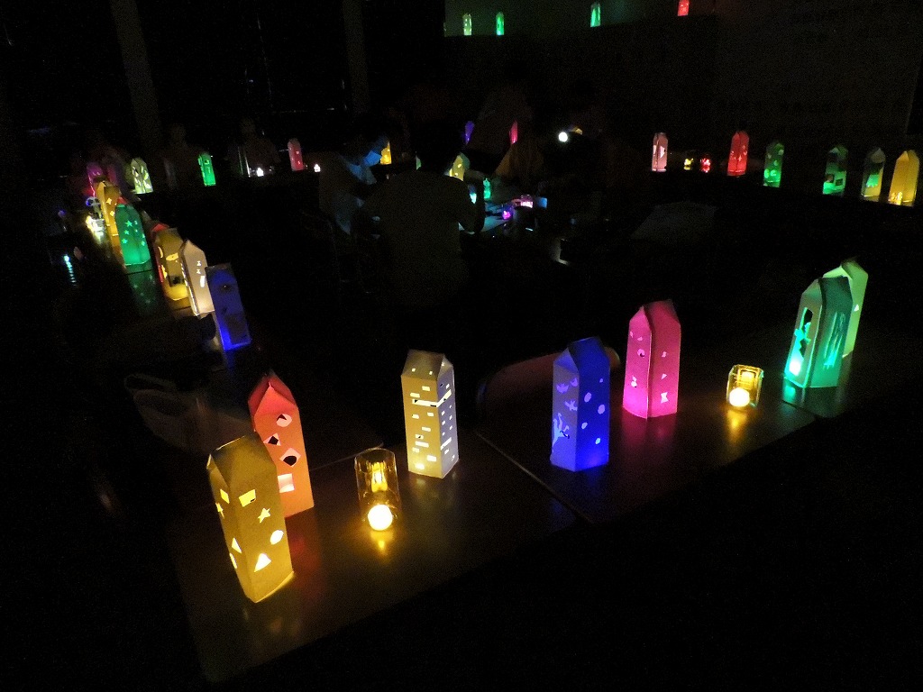 牛乳パックやニュースのパックを利用した「和紙風ランタン」。色の変わるライトが光ります。
