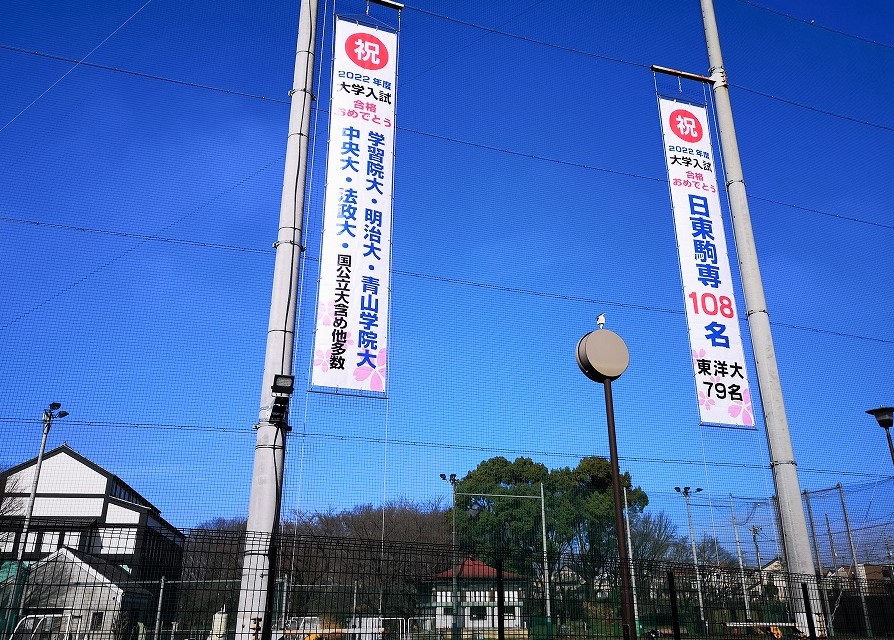 今春の進路実績を伝える懸垂幕が入学予定のみなさんを迎えました