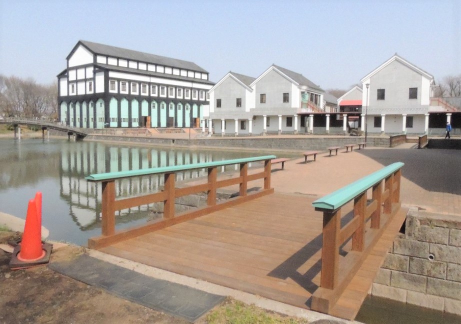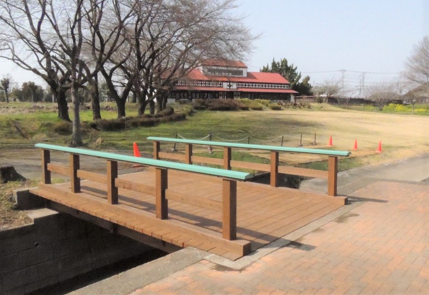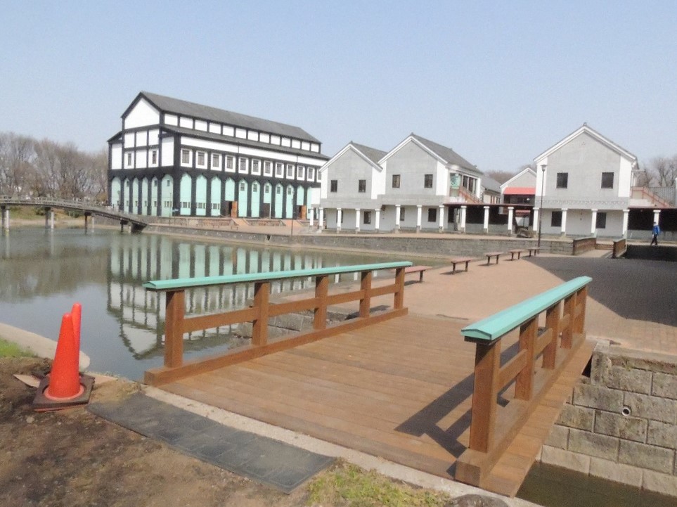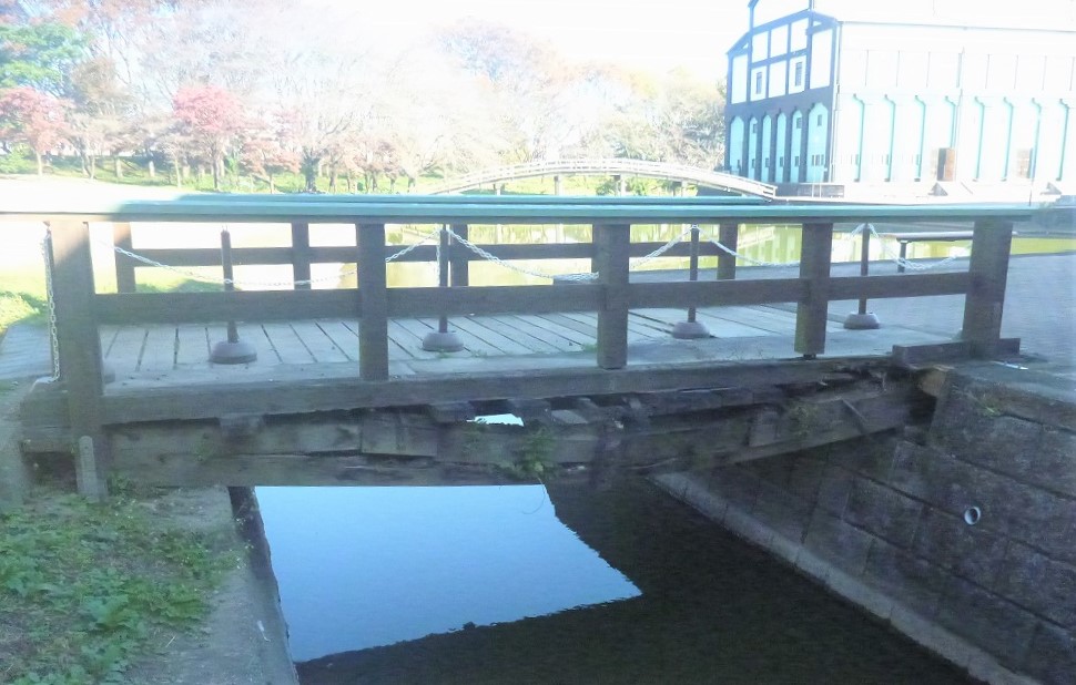 池に面した体育館には堀のように水路が巡っており、今回新しくなった橋の反対側にも小さな橋がかかっています(写真右奥)