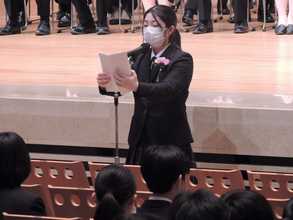 それでも越えられない時には、先生方、先輩方の力もお借りしながら挑戦させていただきたいと思います。私たち新入生は強い精神を保ち、時にはくじけそうなことがあってもあきらめずに、物事をやり抜き、互いの個性を尊重しあいながら切磋琢磨しあい、感受性豊かな人間になることをここに誓います。(抜粋)