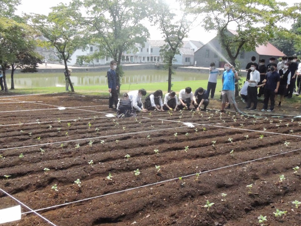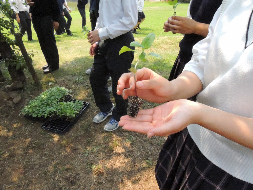本校キャンパス内に「ひまわり畑」をつくるプロジェクトがスタート、2日はホームルームの時間を利用して生徒がひまわりの苗を定植しました。