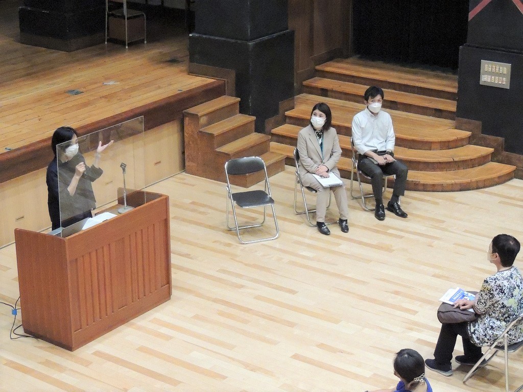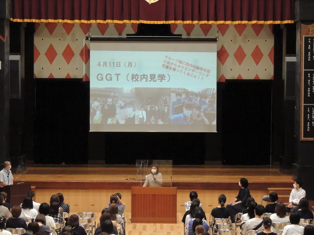 大講堂での全体会では北村陽子校長があいさつ、1学期を振り返りました。