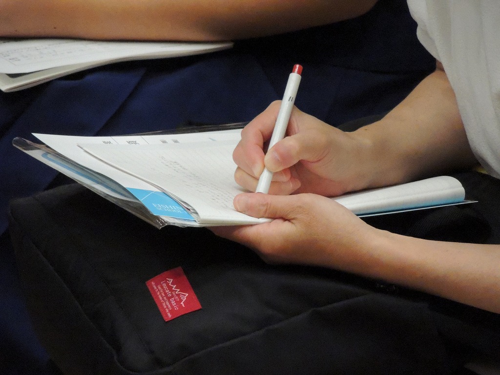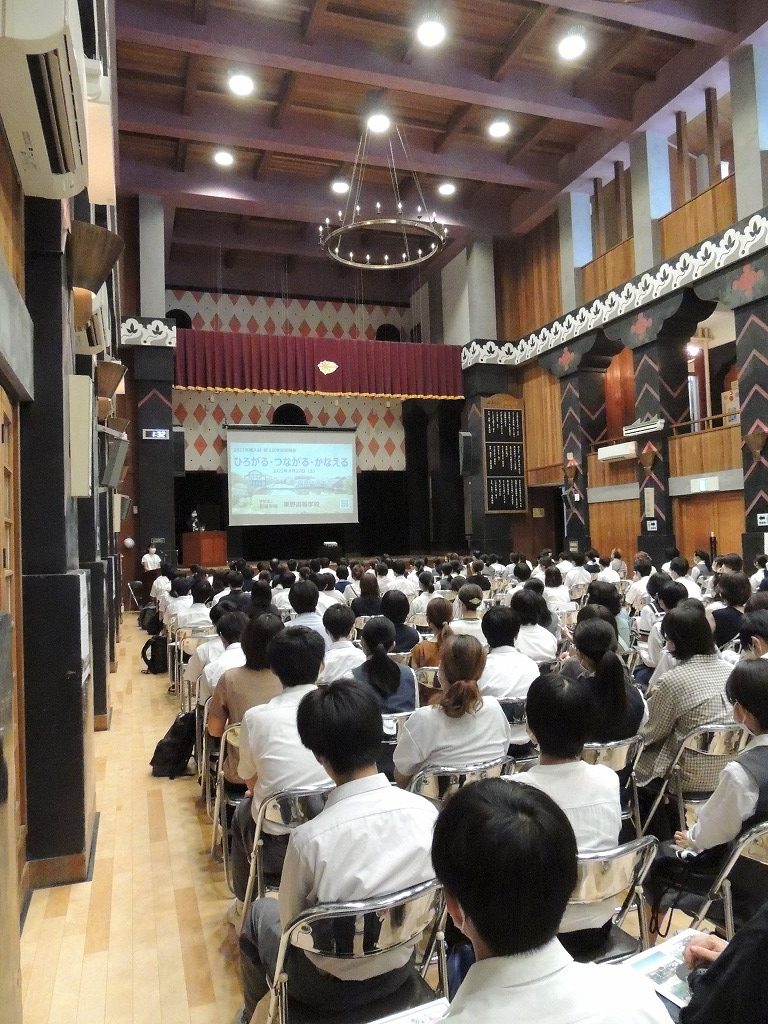 大講堂での全体会では北村陽子校長が二つのコース、三つのクラスの特徴などについて説明し、「みなさんが高校で学びたいこと、取り組みたいことはさまざまでしょうが、その希望に応えられると思います」と話しました。そして「毎日学校へ通い、友だちとともに学ぶことで、たくさんの自信を持つことができ、それはこれからの人生での財産となるでしょう」と呼びかけました。