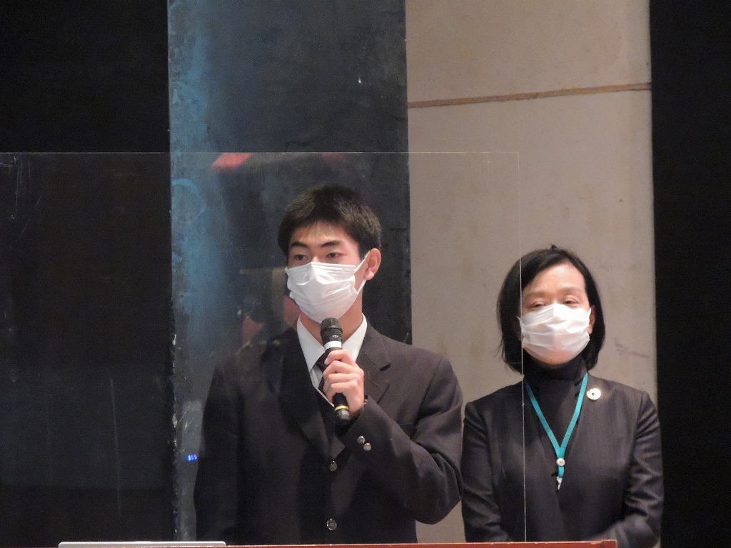 在校生を代表して2年生生徒が登壇。「県立高校が第一志望でしたが、東野高校の学校説明会や部活動体験会などを通じて、新たな挑戦ができそうな環境であり、それを後押ししてくれる先生がいると感じ、東野の単願受験に変更しました」と2年前の高校進学、志望校選びを振り返り、「いま、あの時の選択と決断は間違っていなかったと思っています」と語りました。