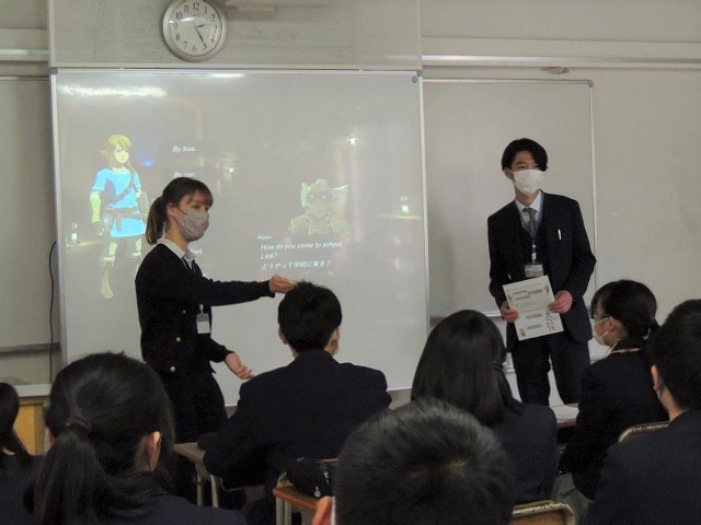 英会話の授業ではネイティブスピーカーと英語科教員が電子黒板型プロジェクターに動画、オリジナル教材を使いながら生徒たちと楽しくやりとりをしていました。
