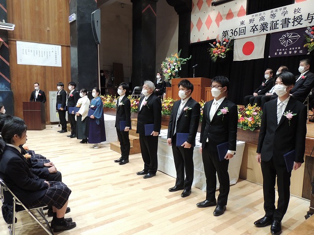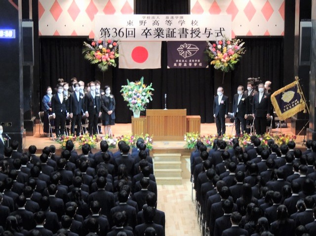 皆さんは世の中の動きや時代の進運に遅れることなく、一人ひとりが日本の未来を担うという高い意識を持って過ごしてください。そして当たり前ですが、この東野高校はいつまでも皆さんの母校です。懐かしくなったら何時でも帰ってきてください。本校卒業であることに誇りを持って、それぞれの道でご活躍されることを祈念いたします。