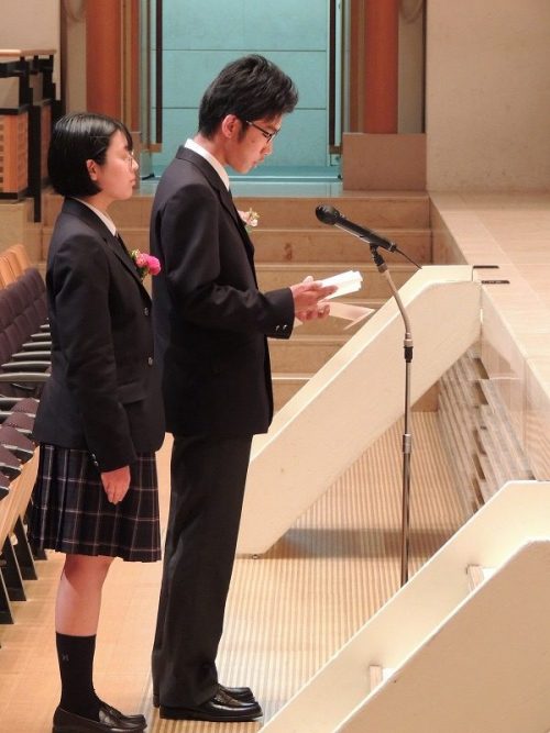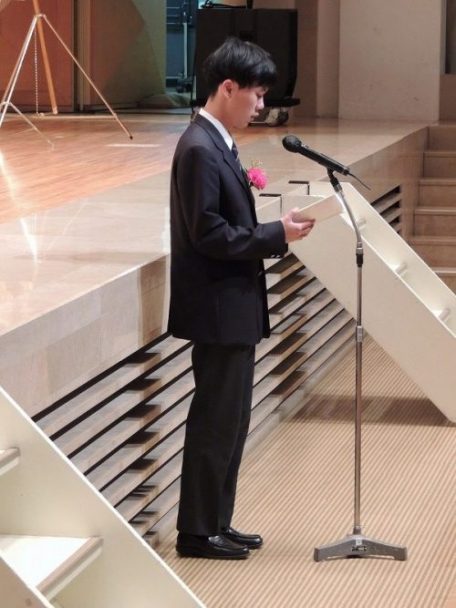 これをもちまして、新入生代表決意の言葉とさせていただきます。本日は誠にありがとうございました。