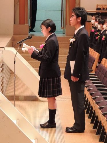 私たちはこれまで、家族をはじめ、小学校・中学校の先生方、友人、部活動の仲間など、たくさんの人たちに支えられ、今日まで進んで参りました。まだまだ至らない点もございますが、この学校に入学し、皆様からのお言葉を頂戴する中で、ぜひとも自ら目標を見つけ、自身の将来へと繋げていきたいと強く実感しております。