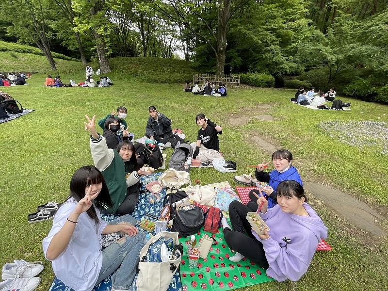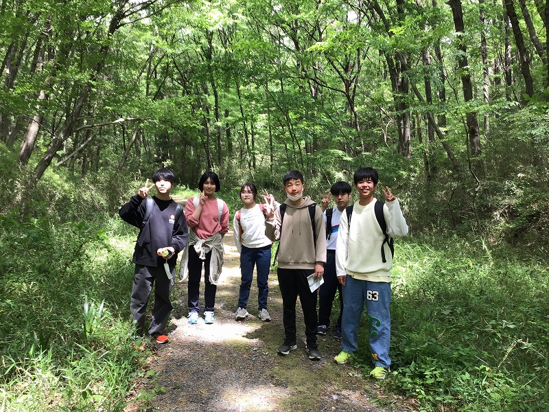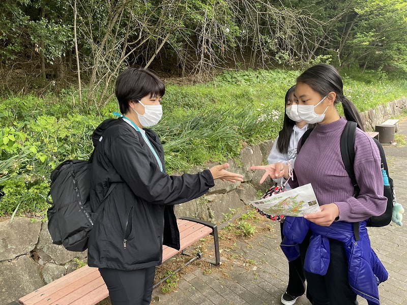 生徒同士がコミュニケーションを図りながら、緑豊かな公園内を歩きました。