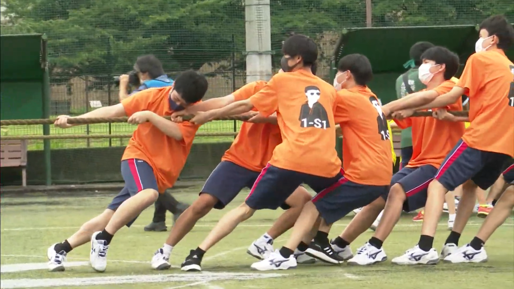 総合グラウンドで熱戦が続く体育祭。団対抗での綱引き、玉入れ、クラス対抗リレーなど盛り上がっています。競技は午後も行われます。