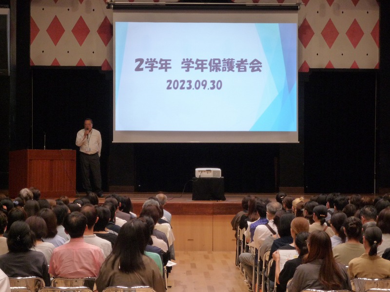 3年間の学校生活の折り返し地点ともなるこの日、お集まりいただいた保護者の皆様には、主に11月の修学旅行、そして希望する進路の実現に向けての説明がありました。
