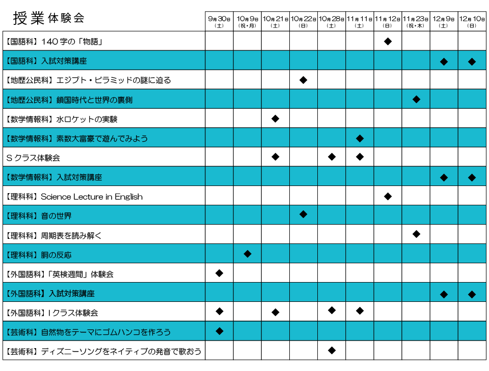 また21日は授業体験会もあります。数学情報科の「水とケットの実験」、Sクラス、Iクラスの授業体験があります。