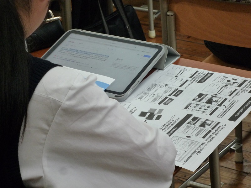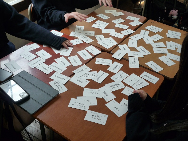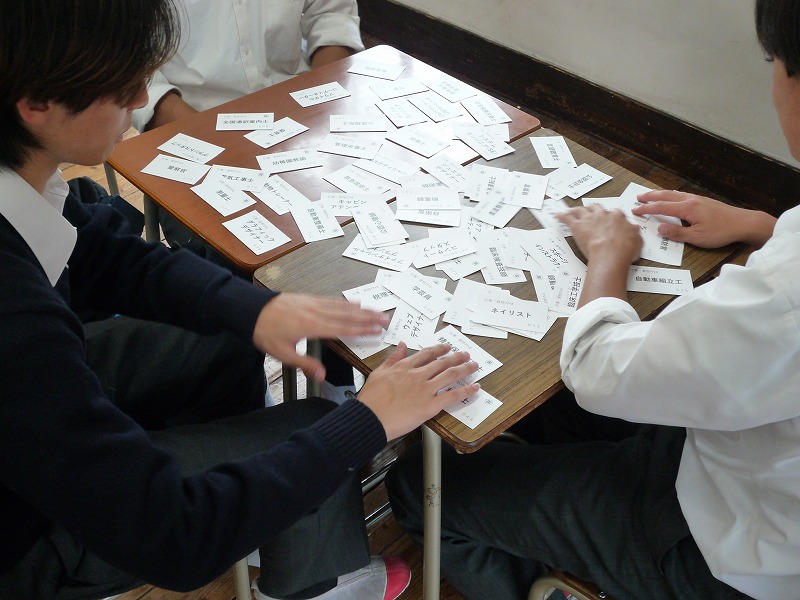 1・2年生全員が所有しているタブレット端末で調べたり、カードを使い、かるたの要領でどのような職業なのか、学んでいました。