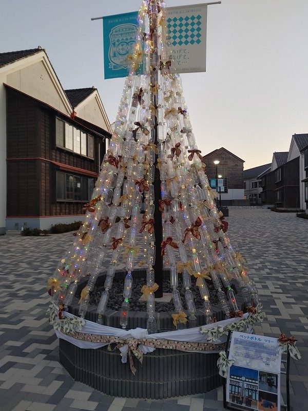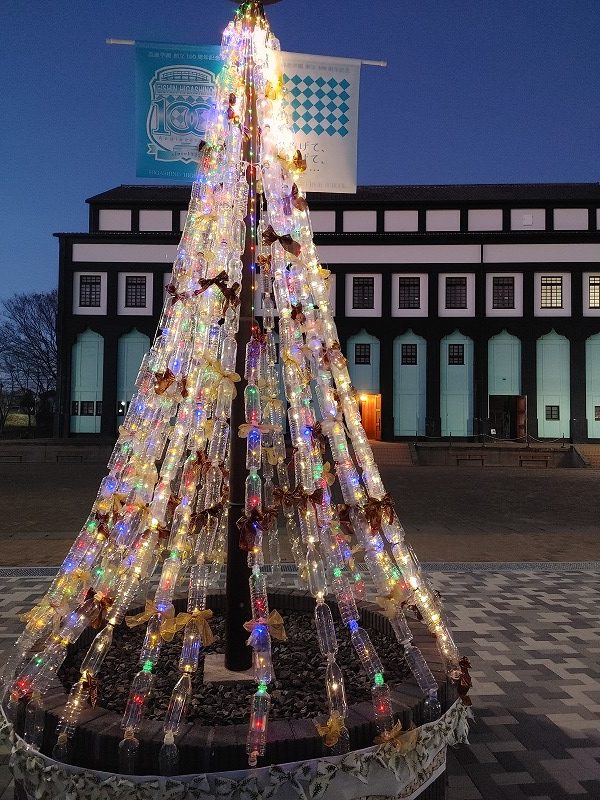 夕方のペットボトルツリーの様子です。よりクリスマス気分が味わえます。