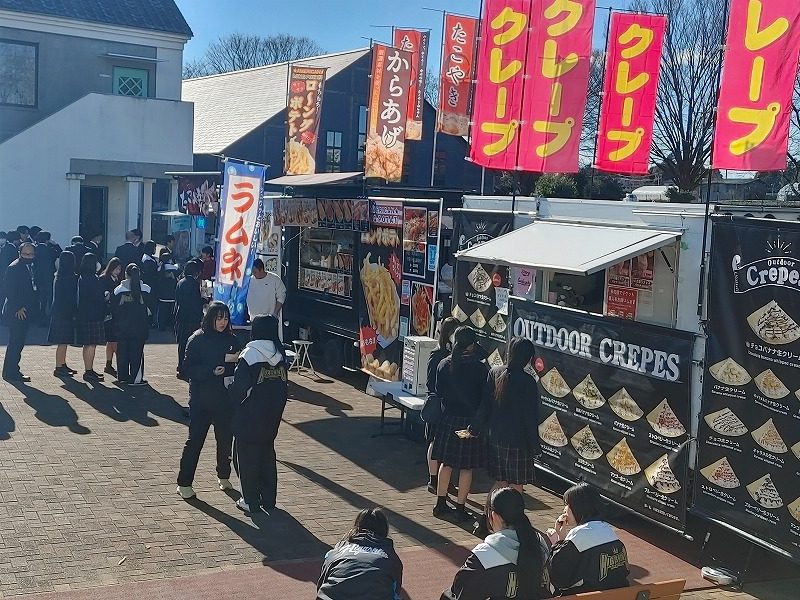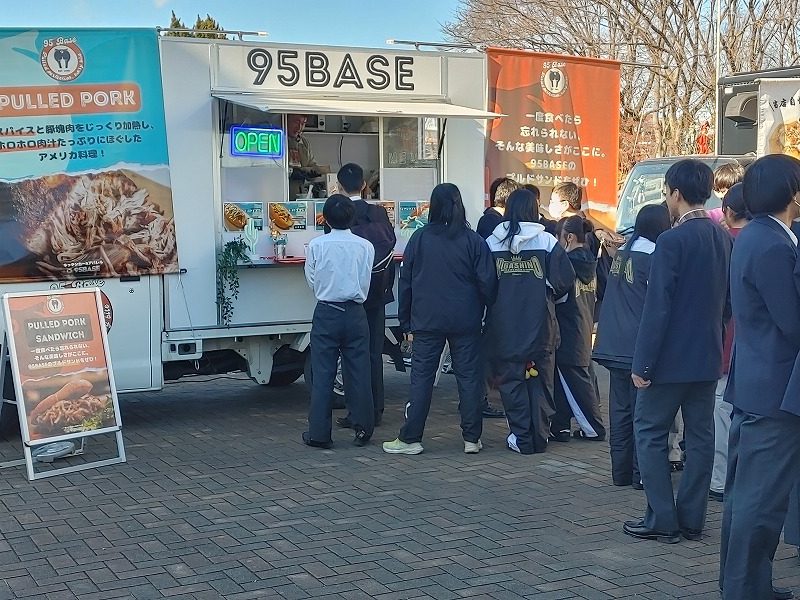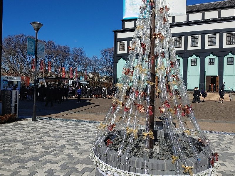 HR通りの時計台には、SDGsに配慮しペットボトルを使ったクリスマスツリーが立ち、中央広場には3台のキッチンカーが来校し、賑わっていました。