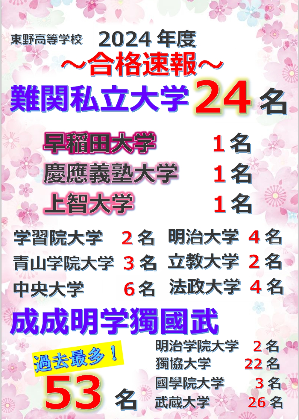 GMARCH(学習院、明治、青山学院、立教、中央、法政)と括られる難関私立大学でも合格者が相次いでいます。また、成成明学獨國武(明治学院、獨協、國學院、武蔵など)の合格者数もすでに過去最多となっています。