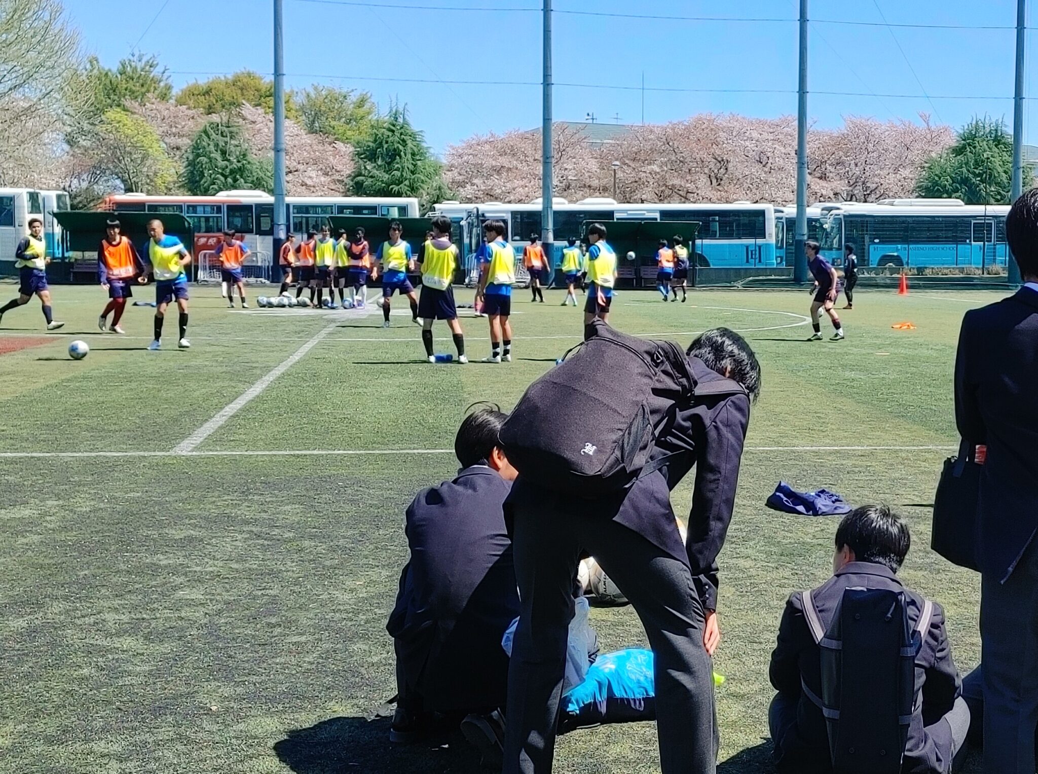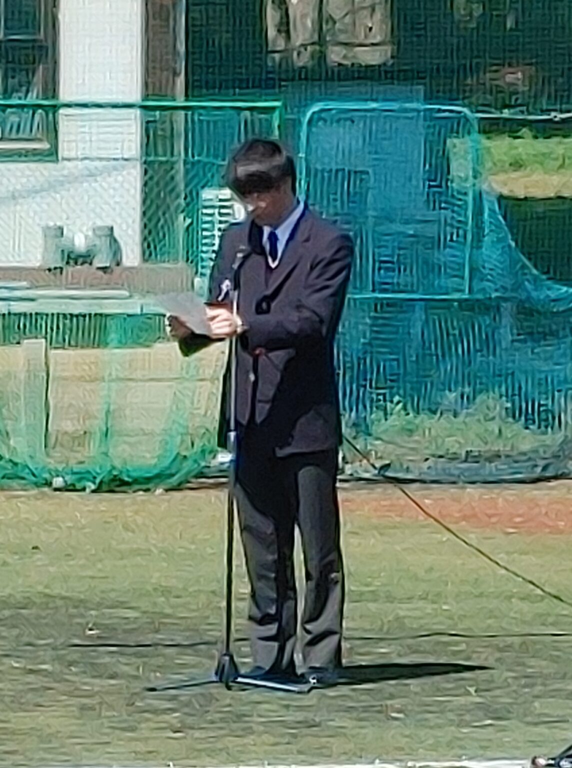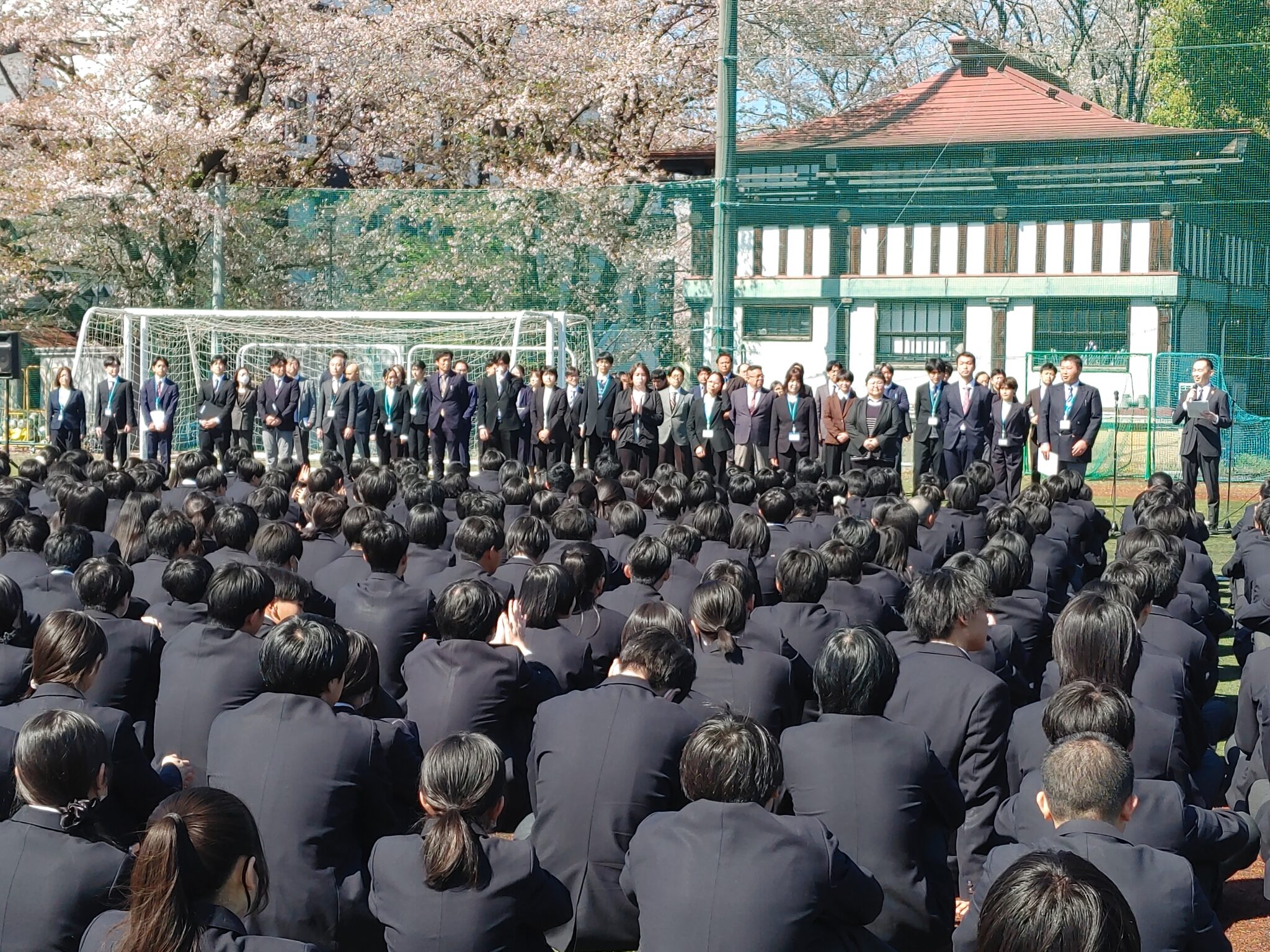 全校生徒が一堂に会しての始業式がグラウンドで行われました。平井廣治校長の挨拶に続き、各学年の所属教員の発表がありました。